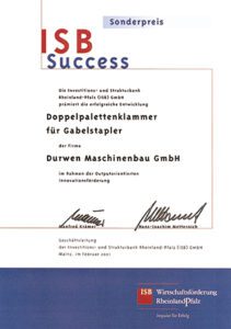 2001 Innovation award “SUCCESS“ by ISB (“Investitions und Strukturbank des Landes Rheinland-Pfalz”) for the development of a double pallet handler for forklift trucks