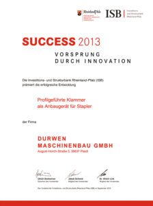 2013 Innovation award “SUCCESS“ by ISB (“Investitions und Strukturbank des Landes Rheinland-Pfalz”) for the development of a profile-guided clamp for forklift trucks