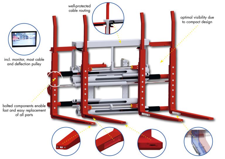 The double pallet handler beverage-PremiumCam is based on a standard DPK unit. The patented extra equipment of three cameras integrated into the forks (SideCam) enables a safe and fast entering of the load. The cameras are positioned in a way that they are protected and at the same time allow for handling pallets at maximum closed fork position. Built-in sensors enable automatic switching to a camera integrated in the fork tip (FrontCam), which can display a safe loading process at the front. As aiming device, one of the forks is equipped with a laser which enables targeting the load carrier.