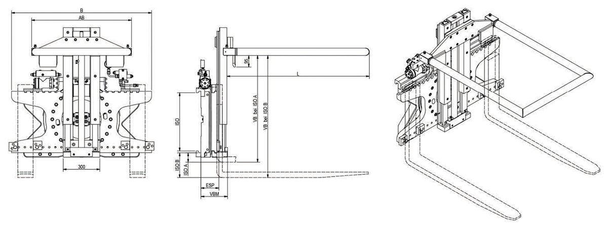 The rotator DG-BK has a bolt-on stabilizing arm and claws to fix a box (container) on the forks. This is a suitable solution whenever the box needs to be rotated 180° for emptying bulk material. The arm and the claws are hydraulically driven and secure the box onto the forks.
