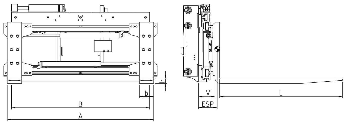 The fork positioner PZV-GSI uses T-profiles to adjust the forks. The compact design offers reliability and excellent visibility for the driver. A constant sideshift allows the entire sideshift to be used in any fork position. Also prepared for the use of standard forks according to ISO 2328. Low weight and a small lost load center support a very good residual capacity. Bolt-on forks are included.