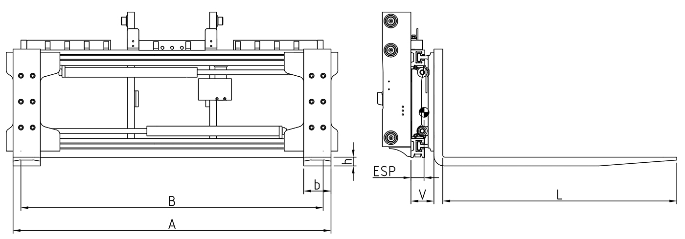 The fork positioner PZV-IG uses T-profiles to adjust the forks. The compact design offers reliability and excellent visibility for the driver. An integral sideshift depends on the actual fork position. Also prepared for the use of standard forks according to ISO 2328. Bolt-on forks are included.