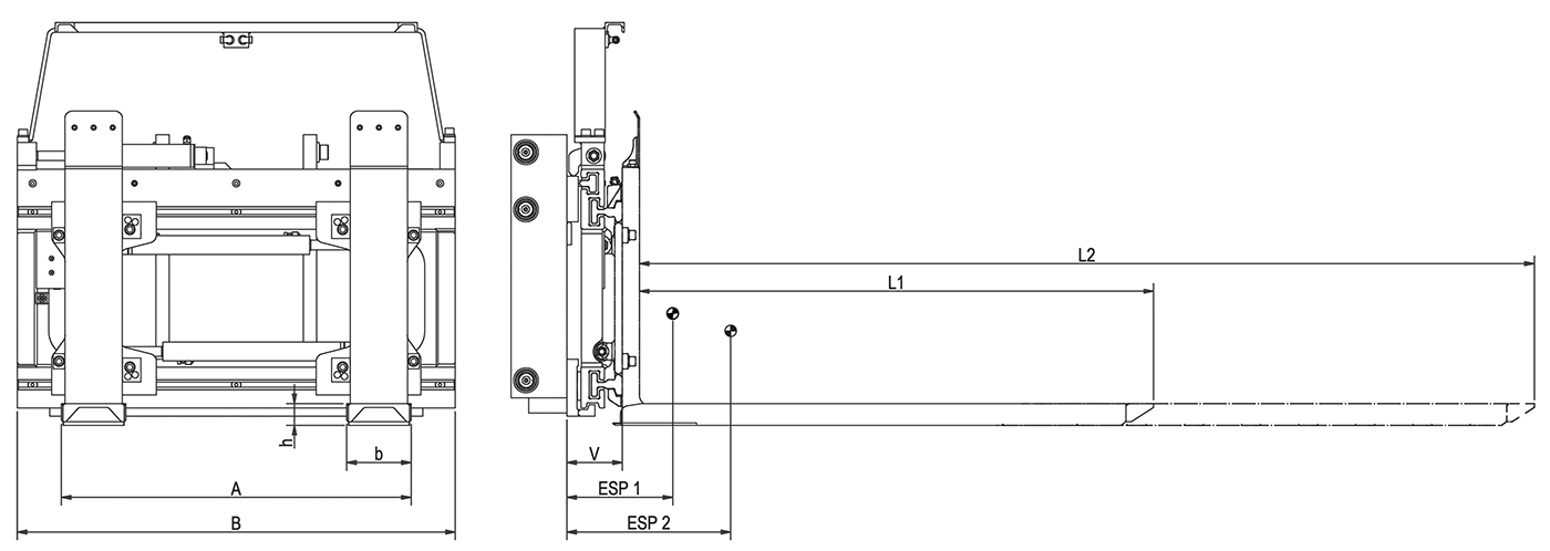 The sideshifting fork positioner PZV-SI-TGZ uses T profile guides. Compact design offers reliability and excellent operator visibility. The constant sideshift operates at any fork position. The combined telescopic forks support faster and safer work due to ideal support of the transported goods. Single side loading is enabled as well. The forks are positioned hydraulically in your daily operation, however the pre-set position of the forks on the carrier can be changed due to the bolted fork stops. Under the table you find the minimum pre-set position available inside to inside fork shanks.