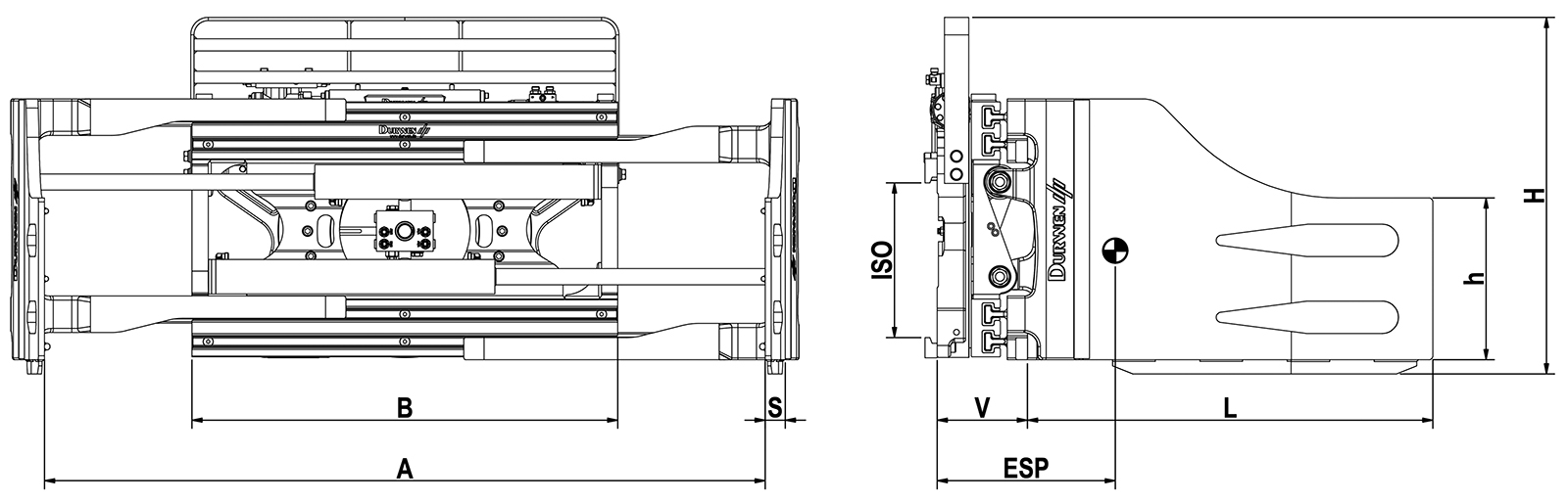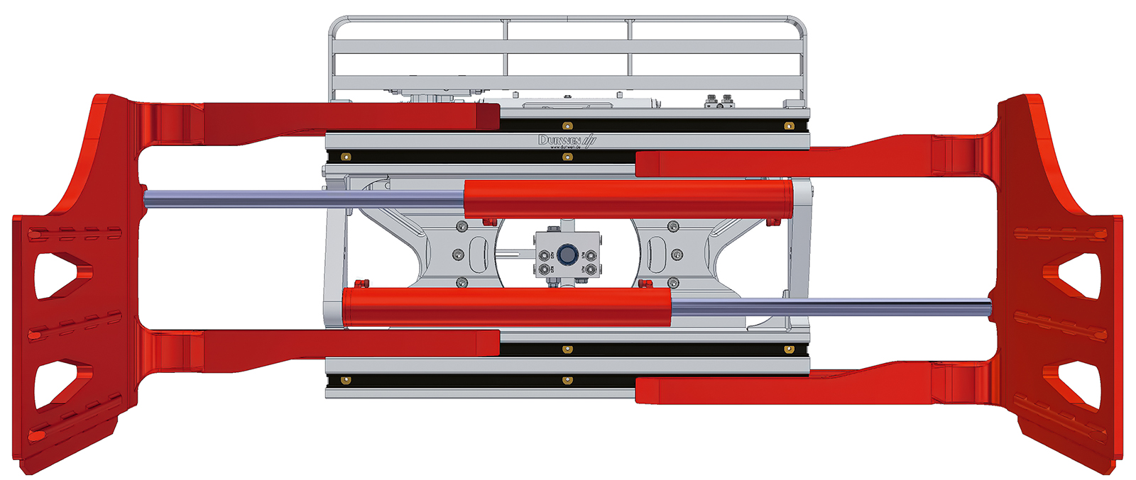 The revolving bale clamp DPBK is made with double T profile guides. This type of profile supports excellent visibility through the clamp. The smooth and flush arms allow for dense stacking of bales. Due to the combined 360° direct drive rotator it can also turn clamped bales e.g. for feeding production lines.