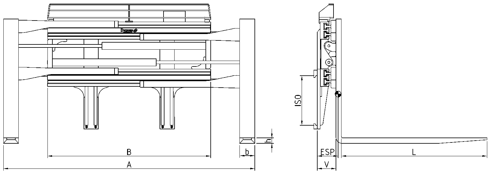 Das Durwen Zinkenvnverstellgerät Typ ZVP-H für Schubmastapler auf Klammerkörperbasis kann aufgrund seiner hochgebauten Konstruktionsweise Verstellbereiche ermöglichen, die weit über die Kontur der Staplerbreite hinaus gehen. Dieses Gerät eignet sich für An wen dungen, bei denen unterschiedlichste Verstellbereiche, von der Europalette bis zur Aufnahme von Langgutmaterialien gefordert werden. Das Gerät ist nicht zum Klammern geeignet.