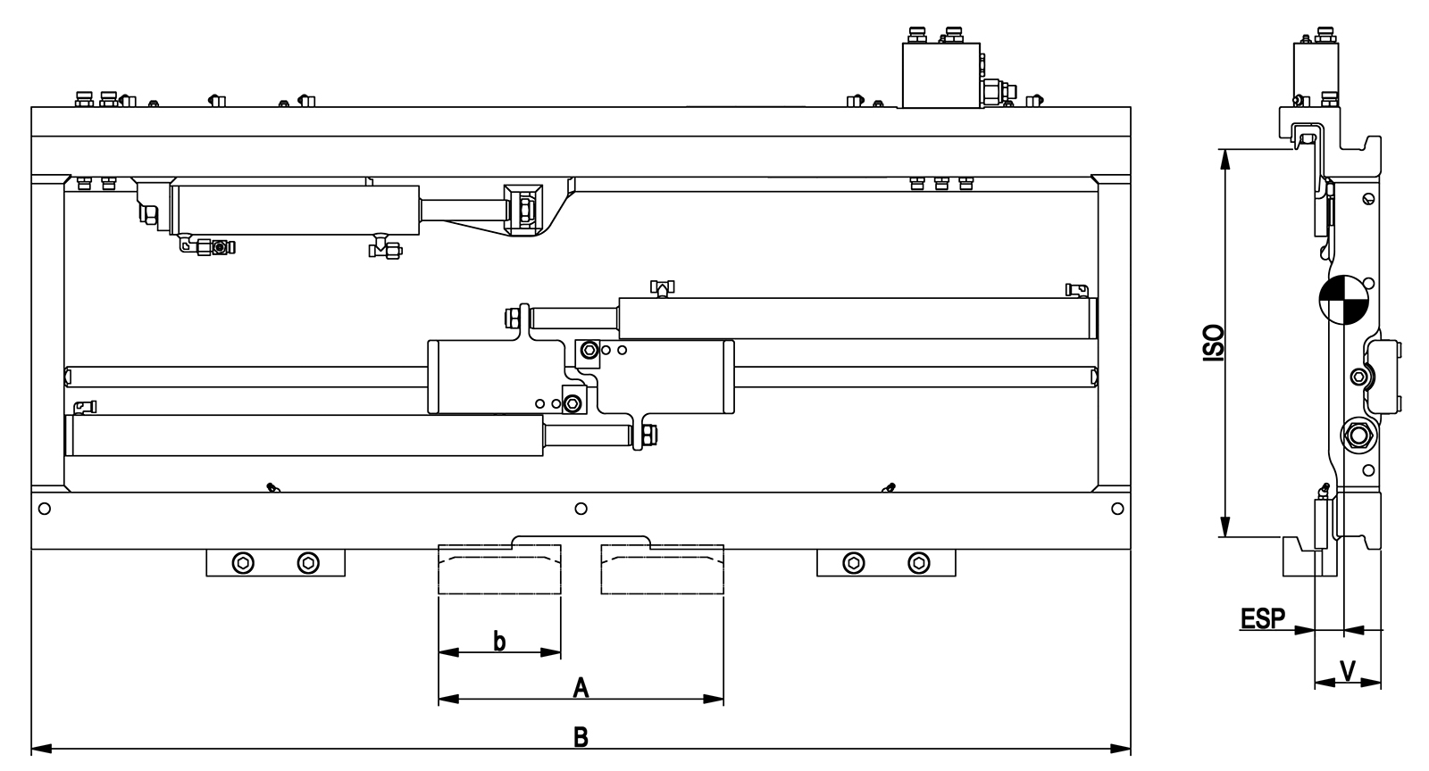 Das Zinkenverstellgerät Typ LZV-S ist ein leichtes Zinkenverstellgerät. Es ist serienmäßig mit separatem Seitenschub, d.h. Seitenschub bei jeder Gabeleinstellung, ausgestattet. Die Zinkenein stellung erfolgt mittels zweier Hubzylinder. Es wird die Standard gabelzinke nach ISO 2328 verwendet. Ein optimierter Aufbau ermöglicht beste Sichtverhältnisse und ein stark reduziertes Gewicht. Für die Aufnahme von Spreizkräften ist das Gerät nicht geeignet (nicht zum Klammern geeignet)
