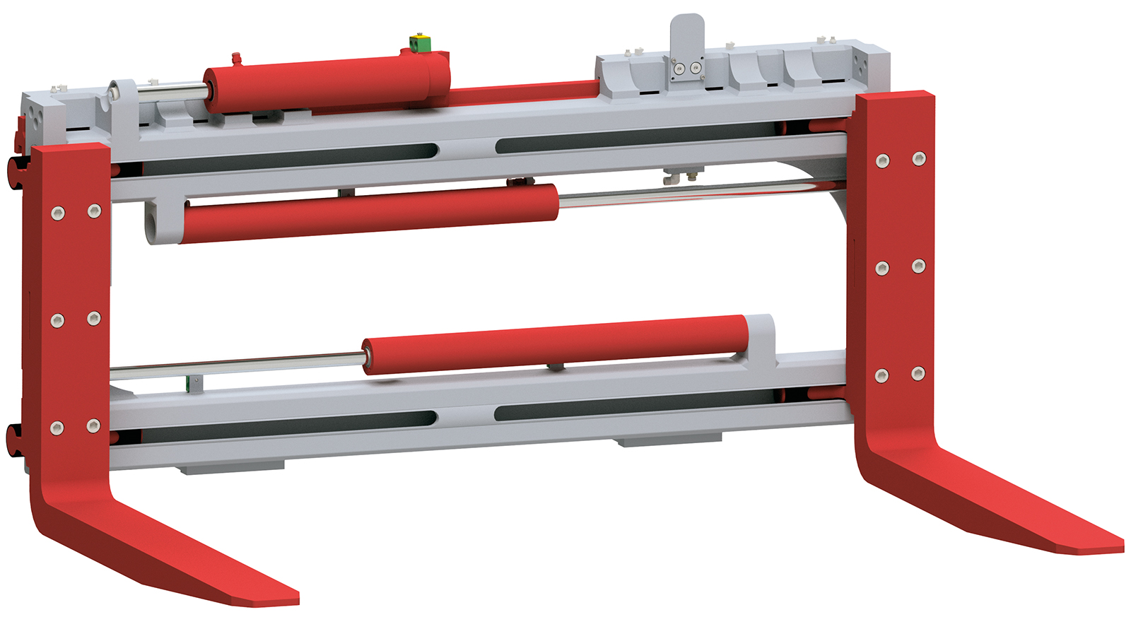 Das Zinkenverstellgerät Typ RZV-GS besitzt eine stabile Rundführung, in der die beiden Zinkenträger mit den geschraubten Gabelzinken verschoben wird. Der separate Seitenschub ermöglicht die Nutzung des gesamten Seitenschubs bei jeder Gabelstellung. Vorbereitet auch für die Verwendung von Standardgabelzinken nach ISO 2328.