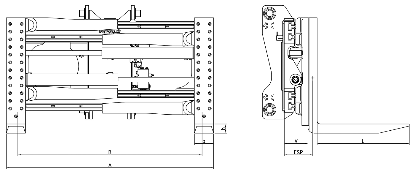 zusammengefahren sind, hat das Gerät keinen Seitenschub. Dieses Gerät wird individuell für das Hubgerüst des Großstaplers angepasst.